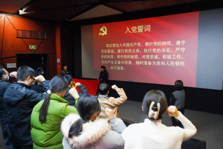 观影前,全体党员共同重温入党誓词,面对鲜红的党旗,大家庄严宣誓,铿锵恢宏的誓词,震撼着在场的每一位党员,一字一句都神圣而豪迈,共产党员的责任感和使命感在心底激荡。