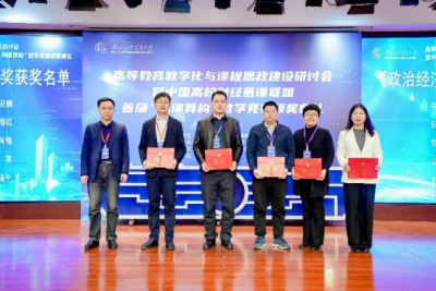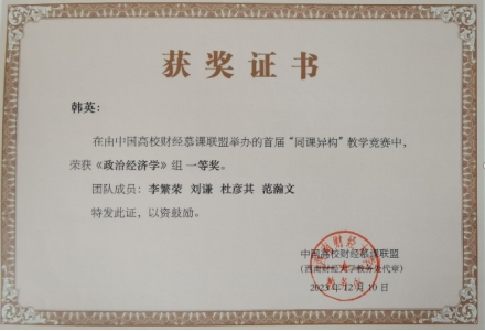 12月10日,由中国高等教育学会高等财经教育分会指导,中国高校财经慕课联盟主办,全国财经类高校课程思政联盟协办的高等教育数字化与课程思政建设研讨会暨中国高校财经慕课联盟首届“同课异构”教学竞赛颁奖典礼在对外经济贸易大百家乐算牌 隆重举行。百家乐算牌 韩英副教授荣获《政治经济学》组一等奖,团队成员包括李繁荣教授、刘谦副教授、杜彦其老师和范瀚文老师。